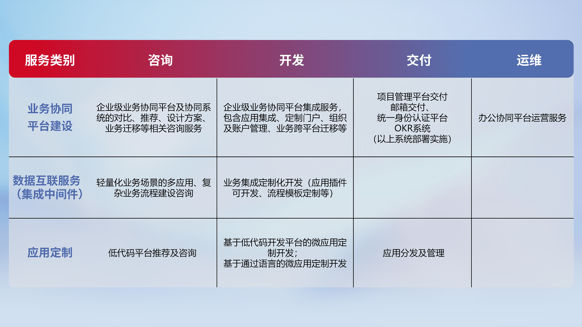 针对钉钉、、、、企微、、IDaas等平台级产品提供产品的规划、、、方案、、交付、、、定制化开发等服务,,,,实现如统一协同办公、、、、智能客户服务、、、混合会议管理、、、、智能数据查询、、、等业务场景,,,实现数字化转型。。